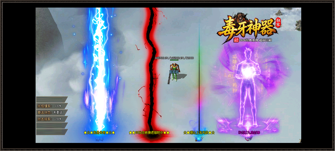 [封杀外挂]: 本服采用最新封挂系统.多倍,秒怪,脱机,暗杀,不管充多少封杀.